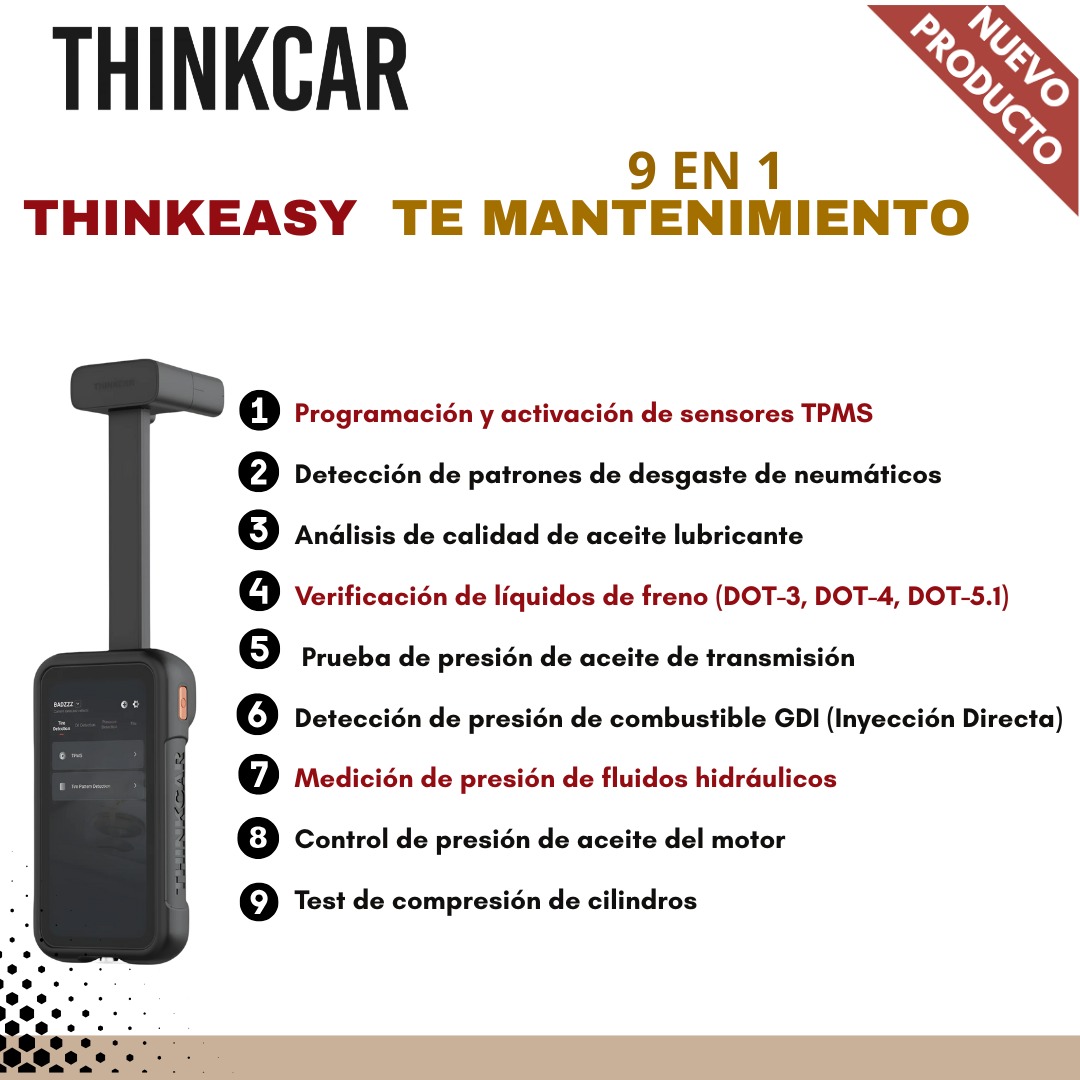 ThinkEasy Maintenance Tester es un comprobador multifuncional NUEVA VERSION 9 en 1 como para comprobar el desgaste de los neumáticos, la vida útil de los neumáticos, el estado de la presión de los neumáticos y la calidad del lubricante y del aceite de freno.